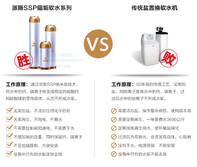 無鹽軟水機,這種技術是最近幾年進入市場的,采用的是物理打包技術,不加鹽,不用電,無廢水。派斯的ssp無鹽軟水機采用的是納米晶軟水技術,是新型的物理軟水方式,借助派斯SSP高能聚合球體,通過吸引、分解重組、結晶成長、脫離等四步把溶于水中不穩定的暫止硬度的碳酸氫鈣、碳酸氫鎂轉變成穩定的碳酸鈣和碳酸鎂的亞微晶體,這樣的水在使用、加熱時就不會生成水垢;這些亞微晶體隨水流動,不附著、不生垢,同時還能與設備里已有的水垢中的碳酸鈣和碳酸鎂繼續結合,從而達到阻垢、除垢的目的。不用電、不產生費水、不加鹽、不用任何化學添加劑,同時保留對人體有益的礦物質和微量元素,是一種綠色環保的軟水機。